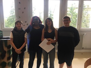 Amira interviewée par Raphaël. Préparation avec Soan et Julian. Jingle créé sur SUNO.