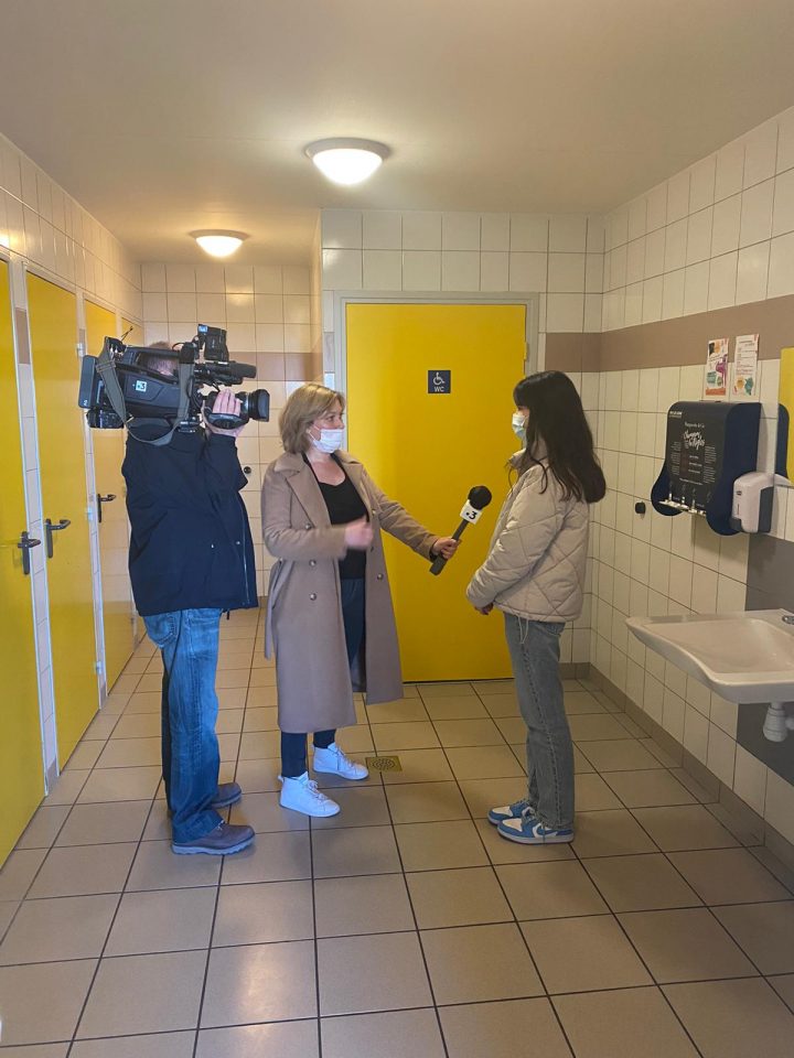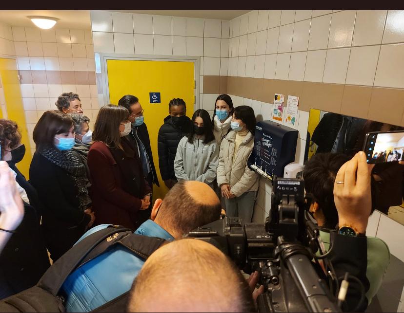 Nafouanta, Mervé, Elza et Rina inaugurent le distributeur de protections hygiéniques gratuites face à la presse