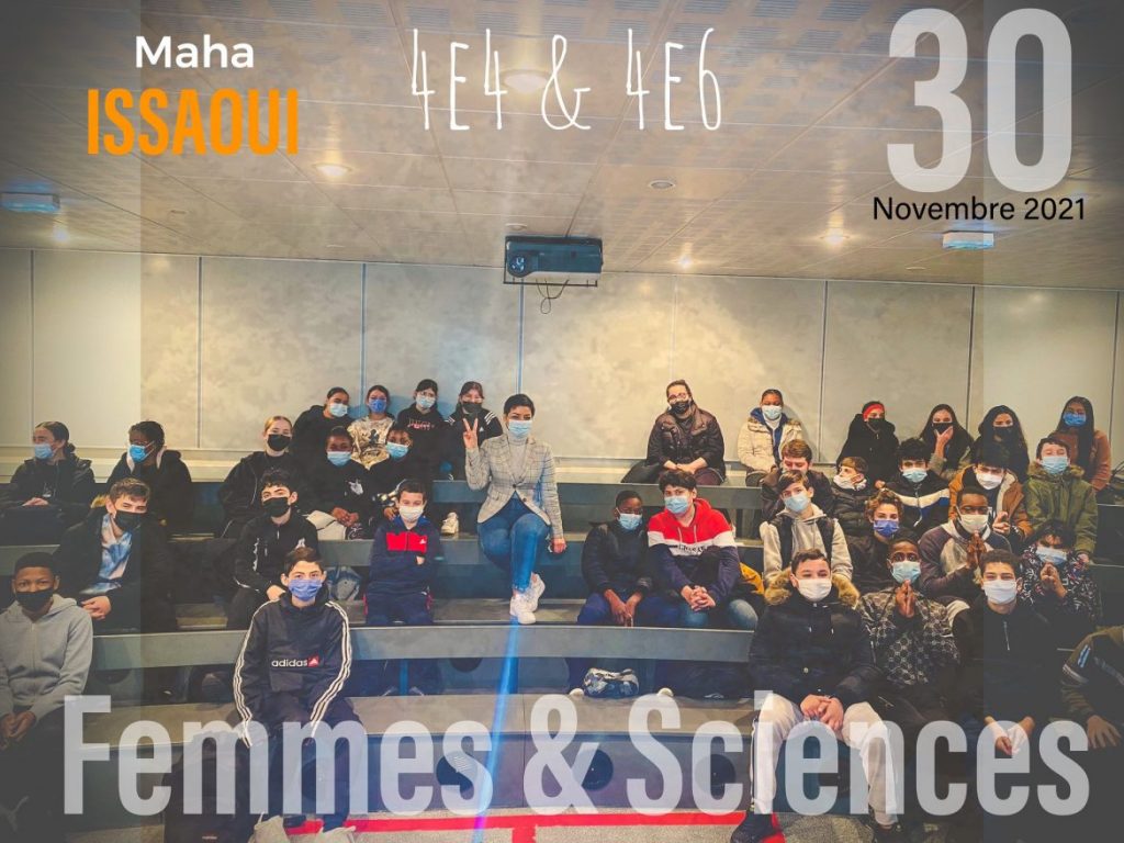 Les élèves de 4e4 et de 4e6 qui participent au projet « Femmes et Sciences » ont eu la chance de rencontrer Maha Issaoui, chercheuse franco-tunisienne à l’Institut Pascal de Clermont-Ferrand.