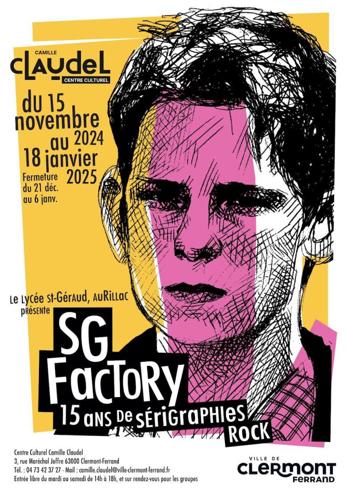 Le Centre Camille Claudel accueille SG Factory pour une exposition rétrospective qui présente 15 années de production sérigraphiée réalisée par les élèves du lycée Saint-Géraud d’Aurillac depuis 2009, au travers plus de 100 affiches de concerts pour la Coopérative de Mai à Clermont- Ferrand, le Sismographe à Aurillac, les festivals Europavox et Hibernarock, ou encore le label Electric Honey à Glasgow…