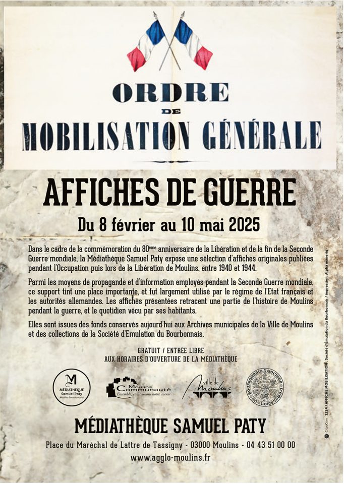 L’exposition Affiches de guerre proposée par la Médiathèque Samuel Paty met en lumière des affiches collectées à Moulins pendant la Seconde Guerre mondiale par Henri Durantin, ébéniste et tapissier moulinois aujourd’hui conservées par la Société d’Emulation du Bourbonnais ainsi que des affiches conservées par les Archives municipales de la Ville de Moulins publiées lors de la Libération de Moulins.