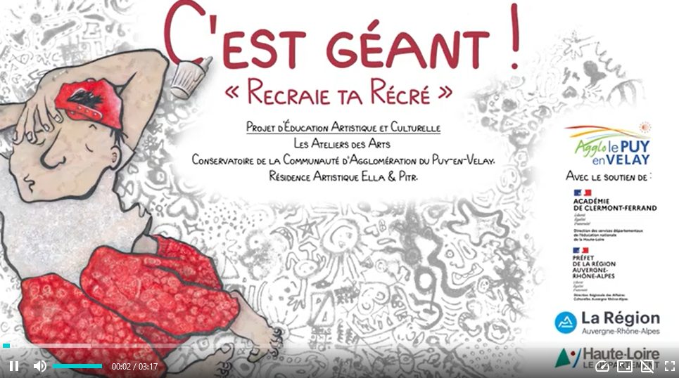 Ella et Pitr, deux artistes stéphanois, viendront en résidence en Haute-Loire en juin 2023. Les classes travaillent essentiellement le dessin éphémère à la craie sur le sol de la cour sur des grandes surfaces. Une période = un défi ! Ce qui permettra de découvrir par la pratique artistique la démarche de création de ces artistes (les graphismes reproduits en grand nombre, les lettres street-art, les personnages géants endormis). A chaque période les enseignants devront envoyer une photo de leur réalisation puis en fin d’année, un drone prendra en photo les réalisations du dernier défi pour certaines écoles.