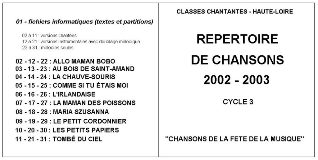 Archives classes chantantes Répertoire 2002-2003 Chansons de la Fête de la musiqueLivret et fichiers audios à télécharger