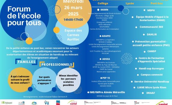 se tiendra à l’espace des Carmes d’Aurillac le Mercredi 26 mars de 14h à 17h L’objectif majeur de cet événement est de réunir les acteurs départementaux et académiques œuvrant à la scolarisation et la prise en charge des élèves en situation de handicap ou relevant de l’enseignement adapté. Les professionnels […]
