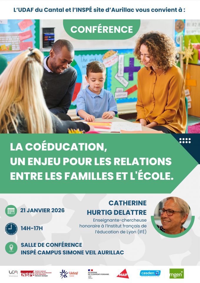 Les enseignants du premier degré du département sont invités par l’UDAF du Cantal et l’Inspé d’Aurillac à une conférence de Mme Catherine Hurtig Delattre intitulé « La coéducation, un enjeu pour les relations entre les familles et l’école ».