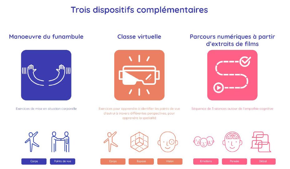 Les trois dispositifs complémentaires structurent l’acquisition de compétences empathiques autour du corps, des émotions et de la conscience.