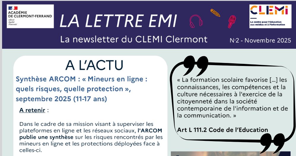 Lettre N°2-Novembre 2025 Le CLEMI de l’académie de Clermont vous propose une newsletter qui paraîtra à chaque période. Brèves, actualités sur le numérique, sur l’EMI, choix de lectures, de podcasts, rapports d’enquête… Le format court de cette publication condense en deux pages toutes les informations essentielles sur l’éducation aux médias […]