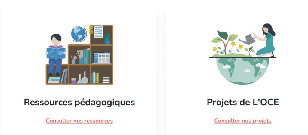 L’OCE met à disposition un panel multilingue de ressources pédagogiques à destination des enseignants, formateurs et du grand public. La recherche au sein de ce réservoir s’effectue par thème (agir pour le climat, agriculture et alimentation, biodiversité, système climatique, conséquences du changement climatique, terres émergées, océan et cryosphère, origines et mécanismes du changement climatique, éducation) ou par type de support (activités de classe, documentation scientifique, animations multimédia, vidéos, développement professionnel).
