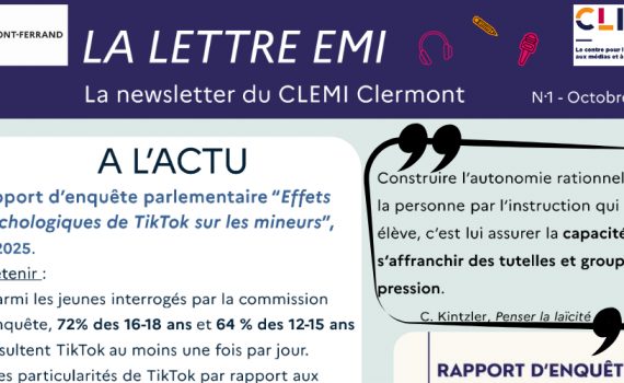Lettre N°1-Octobre 2025 Le CLEMI de l’académie de Clermont vous propose une newsletter qui paraîtra à chaque période. Brèves, actualités sur le numérique, sur l’EMI, choix de lectures, de podcasts, rapports d’enquête… Le format court de cette publication condense en deux pages toutes les informations essentielles sur l’éducation aux médias […]
